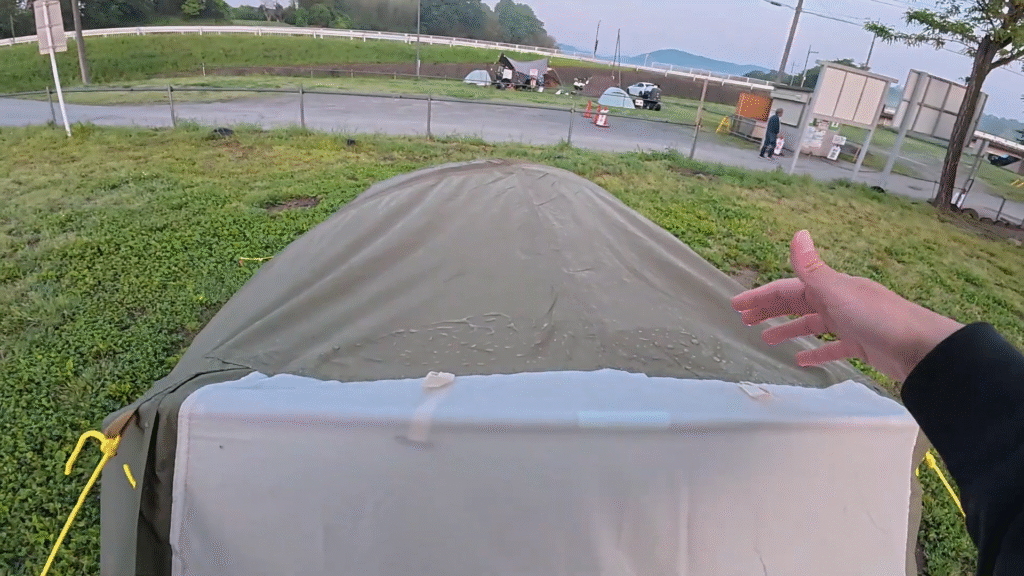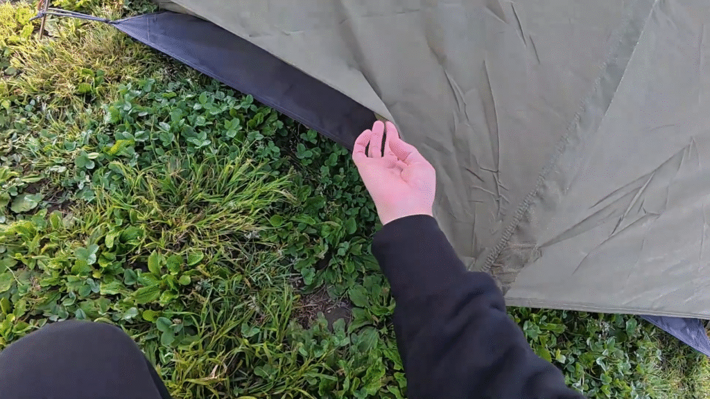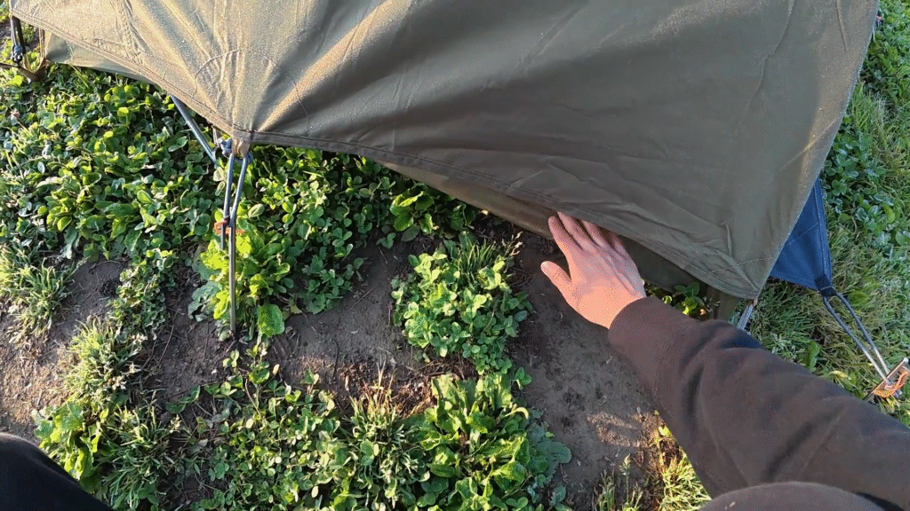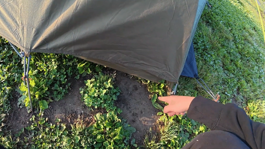 寝袋の足元がきている部分にフライシートが覆いきれていない!
